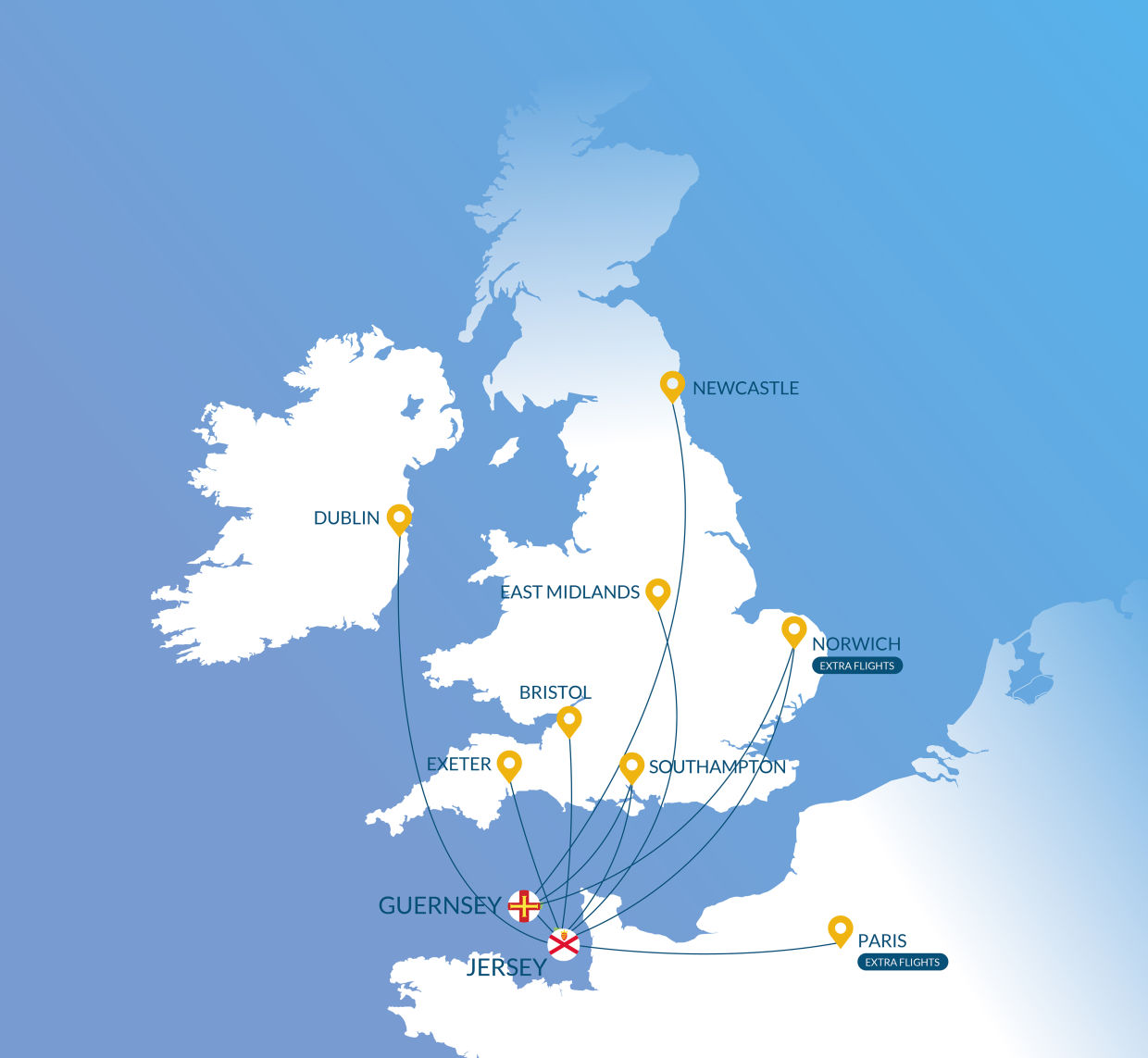 - New non-stop flights will operate between Guernsey and Norwich each week on Thursdays, with one-stop service to and from Jersey